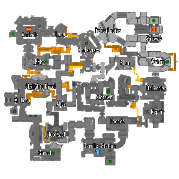 Metro is based on ns2_jambi, therefore most points of interest overlap with their equivalent on Jambi. Since Aliens will always start in either Subway or Arrivals, the main goal for Marines is to control, or at least deny Underpass, in order to stop the Alien Team to expand to the other one of the two. This is done the quickest through Facade and Midtown.